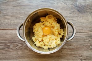 Разбейте в картофельное пюре яйцо.