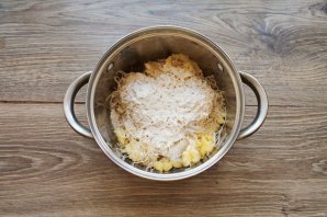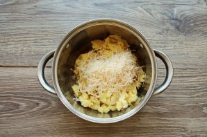 Твердый сыр натрите на средней или мелкой терке и добавьте в кастрюлю с пюре.