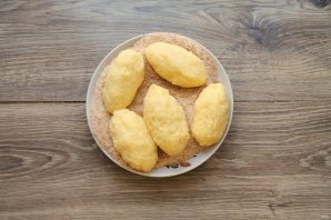 Влажными руками сформируйте картофельные зразы по типу котлет и запанируйте в сухарях.