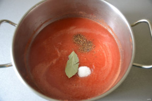Place the saucepan with ketchup over heat, add salt, sugar, pepper, and bay leaf, and simmer the mixture over low heat until thickened, for 30-40 minutes.