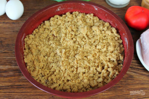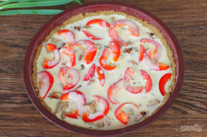 Заливку из сметаны и яиц выливаем на начинку. Отправляем форму в духовку. Выпекаем при температуре 170-180 градусов, около 30 минут.