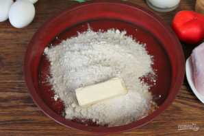 В форму для выпекания насыпаем муку, куркуму и щепотку соли. Добавляем сливочное масло и все перемешиваем.