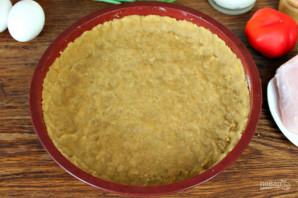 Готовое тесто распределяем по форме тонким слоем. По периметру делаем бортик. Отправляем форму в разогретую духовку на 10 минут.