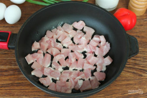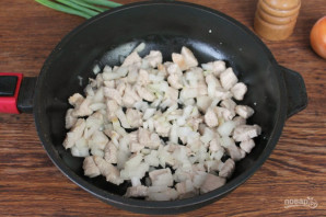 Филе индейки нарезаем небольшими кусочками и обжариваем на подсолнечном масле.