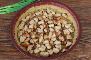 Достаем форму из духовки и высыпаем на основу индюшатину с луком.