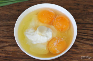 В миску высыпаем сметану, добавляем яйца, чеснок и соль. перемешиваем блендером.