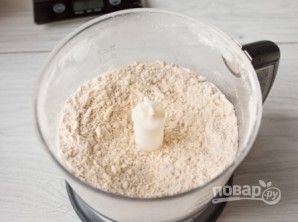 В первую очередь готовим тесто. Перебиваем в блендере муку, соль и холодное сливочное масло до состояния крошки.