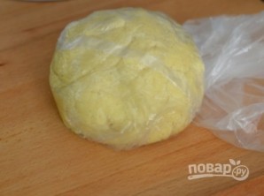 Добавим яйцо и холодную воду и быстро замесим тесто. Заворачиваем тесто в пленку и убираем в холодильник минут на 30-40.