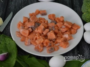 Удаляем из рыбы кости и кожу, нарезаем рыбное филе кусочками среднего размера.