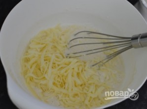 Приготовим заливку. Для этого смешаем яйца с молоком и мукой. Затем добавим соль, перец, измельченный чеснок и натертый на терке сыр.