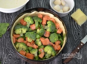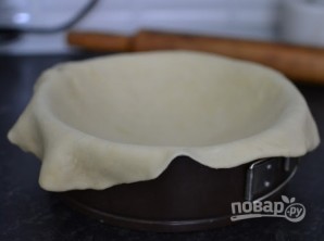 Форму для выпечки смазываем маслом. Раскатываем тесто и формируем дно с бортиками. Вилкой сделаем несколько проколов по дну.