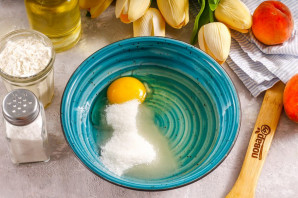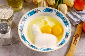Влейте в глубокую емкость растительное масло, вбейте куриное яйцо, всыпьте соль и сахар. Тщательно размешайте.