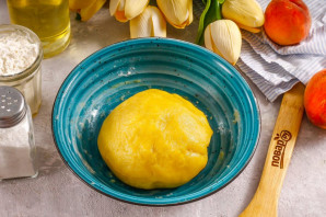 Персики промойте в воде, удалите косточки, нарежьте кубиками или ломтиками и выложите в начинку.