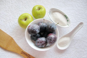 Wash the apples, cut them in half, remove the stems and seed cores, and slice into wedges. Add to the plums.