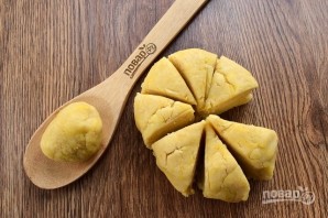 Разделите тесто на 2 равные части и каждую поделите на 8 частей, примерно по 40 г.