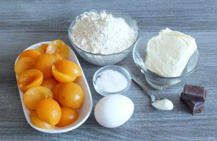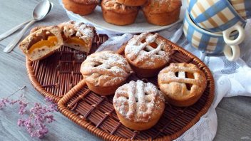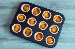 По истечении времени достаньте тесто из холодильника. Отмерьте 12 частей весом по 50-60 грамм. Оставшееся тесто отложите. Из частей скатайте шарики, вложите в формочки для корзиночек. Хорошо распределите по формочке. В середину заготовки выложите половинки абрикосов.