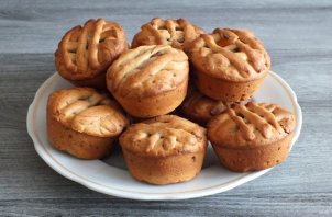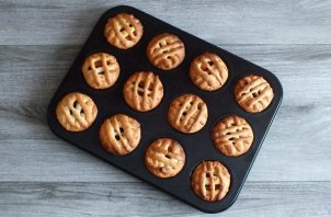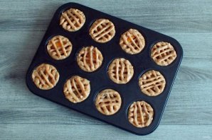 Отложенное тесто поделите на 12 кусочков. Из каждого кусочка скатайте жгутики. Из них сформуйте сетку на каждую корзиночку. Подготовленные заготовки уберите на 20 минут в холодильник. После поставьте в разогретую до 180 градусов духовку на 25-30 минут. Учитывайте особенности своей духовки.