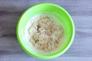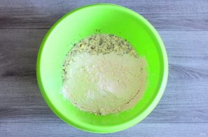 Добавьте муку, разрыхлитель, соду, соль. Начните замешивать тесто с помощью вилки.