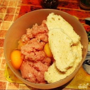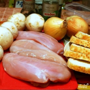 Из куриного филе делаем фарш. В фарш добавляем крошки хлеба, яйца, грибы с луком, и немножечко воды. Солим, перчим и хорошенько вымешиваем фарш.