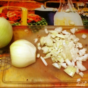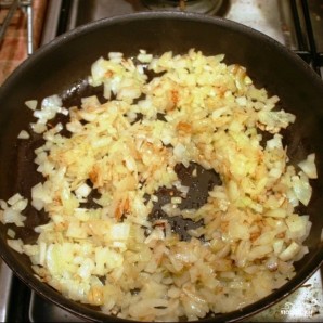 В сковороде разогреваем немного масла, бросаем в него лук, обжариваем на среднем огне до золотистости.