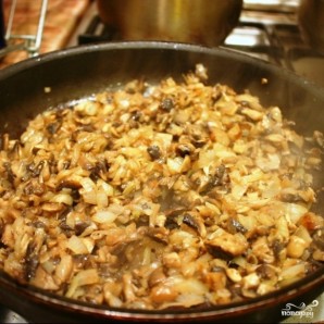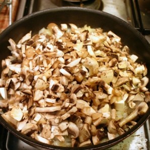 Жарим на среднем огне около 10 минут - нужно, чтобы грибы выпустили жидкость, и чтобы эта жидкость полностью испарилась.