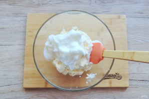 Добавьте в творог крахмал и перемешайте.