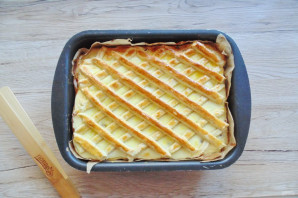 На творожной начинке выложите полоски в виде сетки.