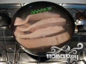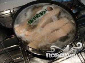 Положить куски лосося в горячую соленую воду с букетом гарни.