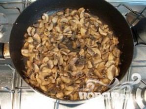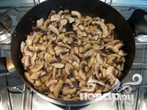 Положить кусочки масла в сковороду, добавить нарезанный лук, соль и перец. Жарить одну минуту и добавить грибы, хорошо перемешать.