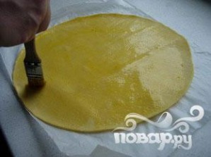 Раскатать слоеное тесто, смазать взбитым желтком яйца. Положить обратно в холодильник на один час.