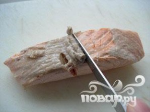 Варить на медленном огне, пока мясо лосося станет непрозрачным (4 - 5 минут). Слить воду и дать остыть немного.
