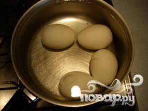 Сварить яйца вкрутую. После 10 минут кипения, убрать яйца и положить в холодную воду. Очистить и положить обратно в холодную воду. Когда яйца полностью остынут - нарезать ломтиками вдоль.