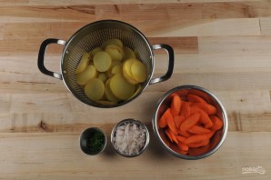 1. First, peel, wash, and slice the potatoes into rounds. Boil them in salted boiling water for 9 minutes. Then drain the water. At the same time, finely chop both types of onion. Cut the carrots diagonally.