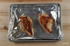 2. Rub the chicken breast with salt and pepper. Sear it with 1 teaspoon of oil for 3 minutes on one side and another 2 minutes on the other side. Then transfer the chicken to a baking sheet lined with foil. Bake in the oven at 200 degrees for 20 minutes.