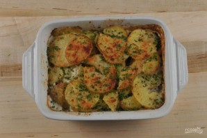 3. While the chicken is baking, prepare the potatoes. Mix them with half of the shallot. Add sour cream, salt, and pepper. Top with grated cheese. Place the potatoes in the oven and bake for 20 minutes. Then sprinkle green onions on top.