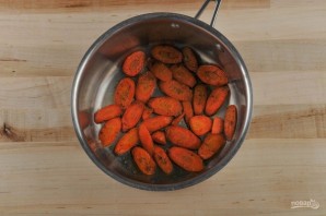 4. Now prepare the carrots. Place them in a sauté pan with sugar, butter, salt, pepper, and pour in water (100 ml). Bring the mixture to a boil and cook for 7 minutes. Then reduce the heat and let the carrots glaze over for 6 minutes.