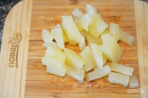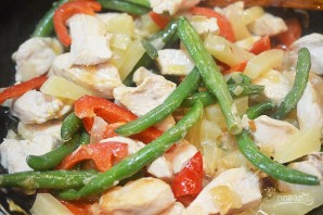 8. Add pineapple, sugar, and fish sauce to the pan, mix well, simmer for about 5 minutes. Add salt if necessary.