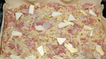 1. Очистите картошку и нарежьте тонкой и мелкой соломкой, репчатый лук измельчите. Сырое куриное мясо нарежьте кусочками. Смешайте подготовленные ингредиенты, посолите и поперчите, добавьте 2-3 ложки воды. Разделите слоеное тесто на 2 части. Раскатайте одну и уложите в форму для запекания, выложите начинку и добавьте кусочки масла.