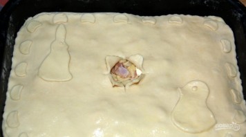 2. Раскатайте второй лист слоеного теста и закройте им начинку, подверните края и скрепите их. Из остатков теста сделайте украшения и с помощью желтка прикрепите их. Смажьте желтком весь пирог, так у вас получится красивая корочка. В центре сделайте глубокий надрез.