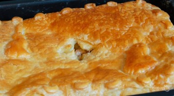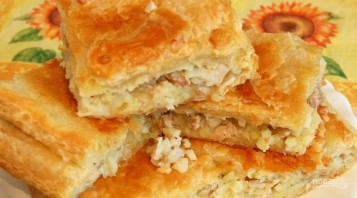 Рецепт не отнимет много времени. Пирог очень сытный и вкусный. Подавайте его спустя 15-30 минут после того, как достали из духовки. Не любите картофель? Тогда замените его отварным рисом или другими овощами. Слоеное тесто можно сделать самостоятельно или купить готовое. Пирог можно украсить остатками теста, тогда будет еще аппетитнее Подавайте тёплым или охлаждённым. Идеально к чаю.