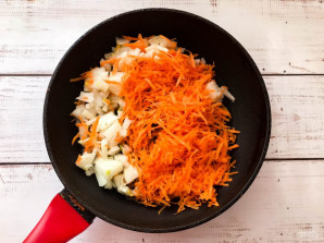 Peel the onion. Wash the carrot thoroughly, peel and grate on a medium grater. Place the vegetables on a well-heated frying pan with vegetable oil and fry for 10 minutes.