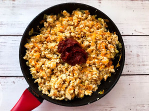 Add tomato paste to the vegetable mince, mix well and simmer for 15-20 minutes.