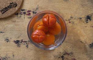 На помидорах сделайте надрезы крест-накрест. Опустите в кипяток на 2-3 минуты. После переложите их в холодную воду, чтобы кожица легко снялась.