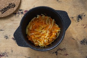 Морковь натрите на крупной терке, а лук нарежьте полукольцами. Обжарьте овощи в растительном масле на небольшом огне около 5-7 минут.