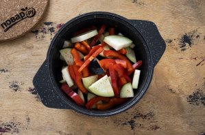 Добавьте в кастрюлю нарезанные брусочками баклажаны и болгарский перец.