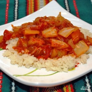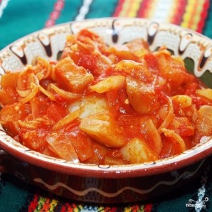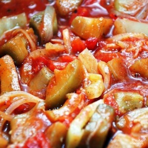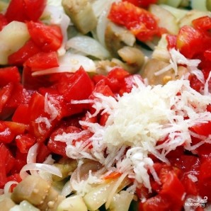 Когда перец станет мягким - снижаем огонь до средне-слабого, добавляем в сковороду мякоть помидоров и выдавленный (либо мелко натертый) чеснок. Перемешиваем, накрываем крышкой и тушим 15 минут.