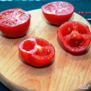 С помидорами поступаем следующим образом: разрезаем их пополам, одну часть нарезаем кубиками, из другой части отжимаем томатный сок.