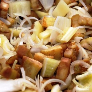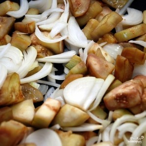 В сковороде разогреваем немного масла, кладем туда баклажаны и обжариваем их 10 минут на среднем огне. Затем добавляем лук и, помешивая, готовим еще около 10 минут.