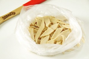 Roll out the ready-made dough and cut it into strips, diamonds, squares, or any shape you like. The thickness can be anything you prefer; I like it thinner.