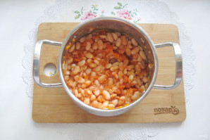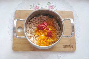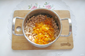 Add stewed onion with carrots to the pot with boiled beans.